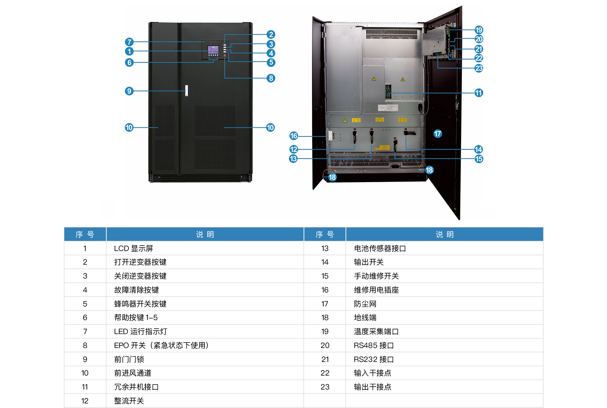 先進的(de)整流和(hé) IGBT 逆變控制(zhì)技(jì)術(shù),在線式三進三出雙>¶€¶變換結構,支持 380/400/415V,50/60Hz 電(diàn)網體(tǐ)系