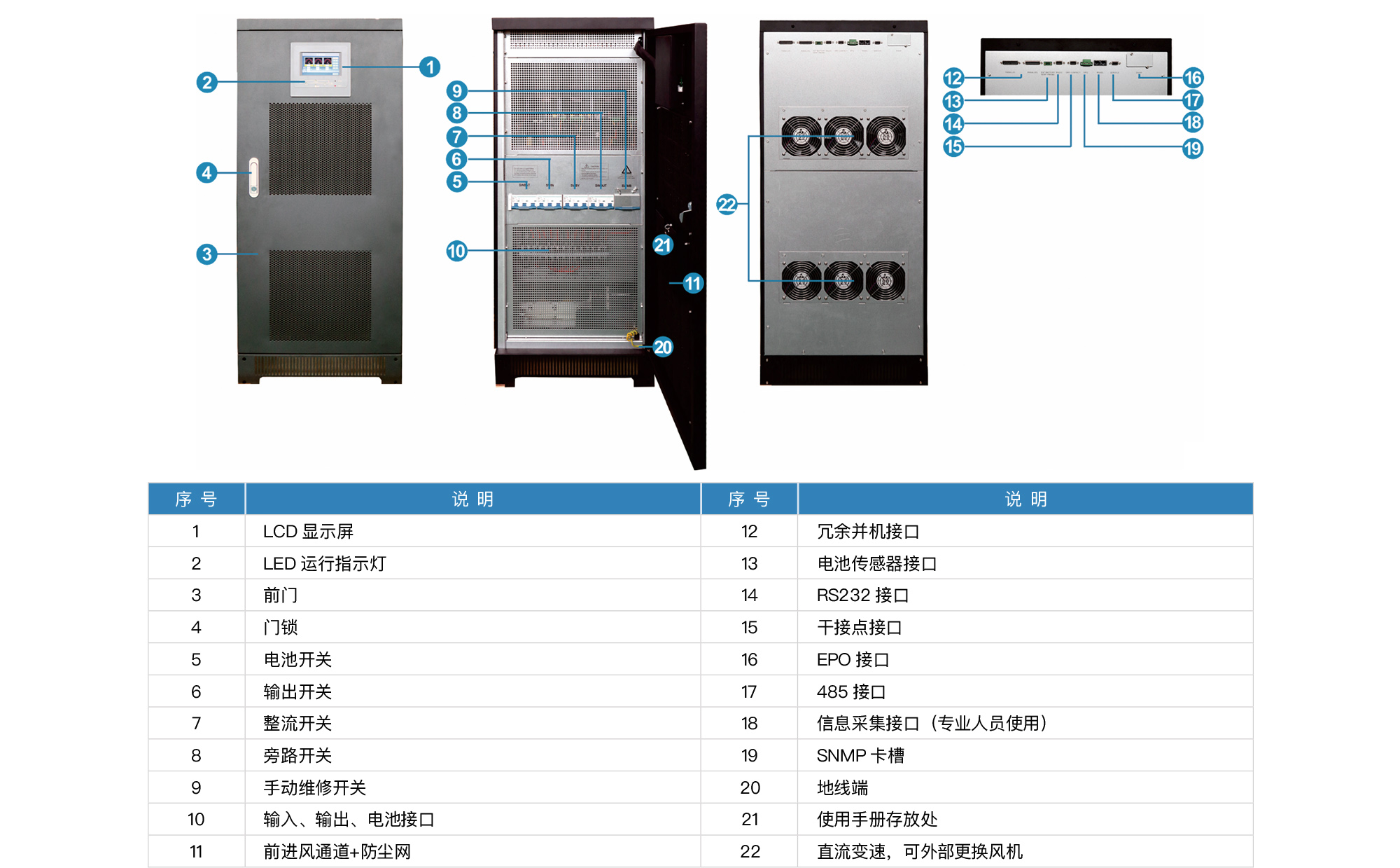 采用(yòng)第五代 IGBT ↔♠$;逆變控制(zhì)技(jì)術(shù),輸出功率因&↕©✔數(shù) PF=0.9;輸₹λ出電(diàn)壓、電(diàn)流性能(néng)更加優異。 ∞在線式三進三出雙變換結構,支持 380/400/415V,♠≤λ50/60Hz 電(diàn)網體(tǐ)系