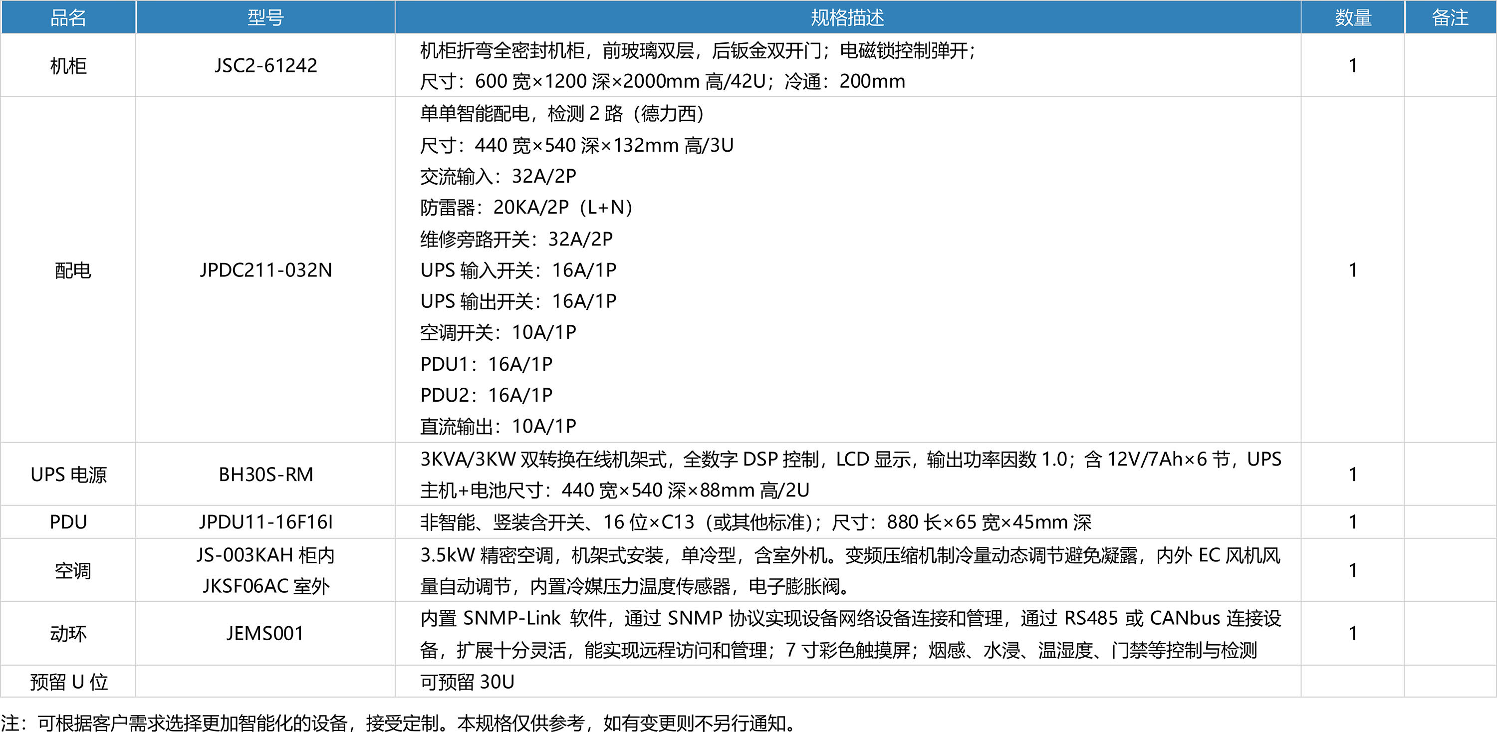 JCS2106N-G 為(wèi)小(xiǎo)型單櫃單電(diàn)源标準配置智能πε(néng)微(wēi)模塊,是(shì)針對(duì)微(wēi)型數(λshù)據中心的(de)一(yī)種解決方案,通(tōng)常機(j"×ī)房(fáng)的(de)占地(dì)面積在 10m2 之內(nèi),主要(yào)應用(yòng)于金πλ (jīn)融、政府、教育、醫(yī)療、小(xiǎo)微(wēi)型企業(y> è)的(de)數(shù)據中心。主要(yào)特點是(shì<$)設計(jì)簡單,部署快(kuài)捷,适應性強,★♠↓λ設備預先預置。非專業(yè)人(rén)員(yuán)可(kě✔∏±Ω)以就(jiù)位使用(yòng)的(de)微α ≥∑(wēi)模塊!